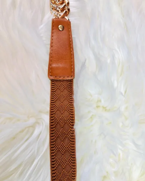 Lindo cinturón de elástico con cuero y cromo bronce con brillos es talla chica, está en muy buenas condiciones.