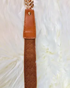 Cinturón elástico tejido. Lindo cinturón de elástico con cuero y cromo bronce con brillos es talla chica, está en muy buenas condiciones.