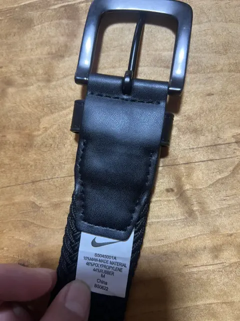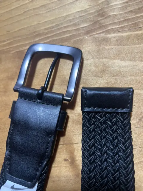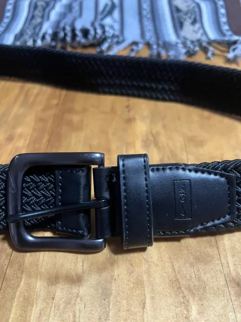 Cinturón tejido elástico Nike GFlex. Fibras de última generación que giran y giran con cada movimiento, proporcionando mayor rango de movimiento, versatilidad de tamaño extendido y máxima comodidad. Ribete de piel de napa y hebilla de arnés de plomizo cepillado con punta de esmalte negro mate en contraste. Detalles de desgaste en hebilla pero casi no se notan. 97 cm aprox.