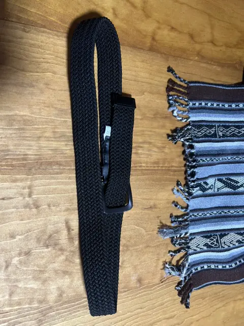 Fibras de última generación que giran y giran con cada movimiento, proporcionando mayor rango de movimiento, versatilidad de tamaño extendido y máxima comodidad. Ribete de piel de napa y hebilla de arnés de plomizo cepillado con punta de esmalte negro mate en contraste. Detalles de desgaste en hebilla pero casi no se notan. 97 cm aprox.