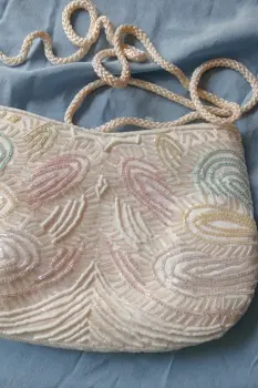 Bonita bolsa blanca con canutillos tornasoles, hecha a mano (está en la etiqueta)En la última foto se ve unos detalles, pero son arreglables y no se ven mucho (No se usó pero tenerla guardada le hizo esos detalles)Medidas: largo 21.5 cm, ancho 14cm