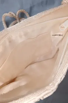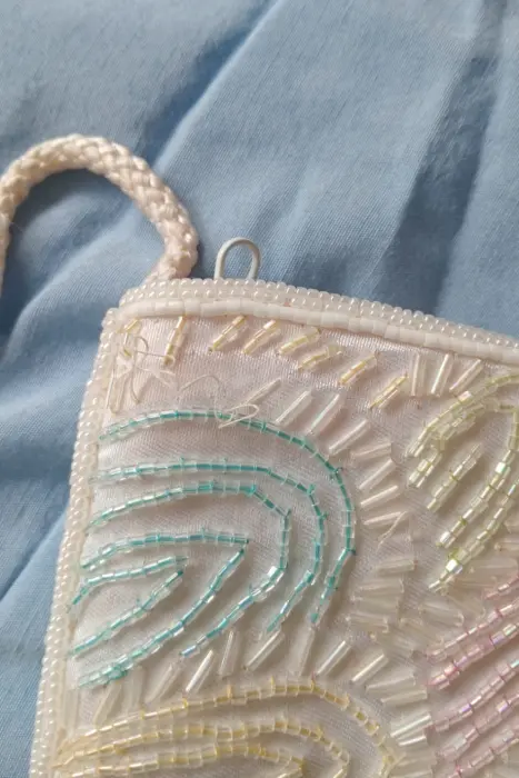 Bolsa canutillo hecha a mano. Bonita bolsa blanca con canutillos tornasoles, hecha a mano (está en la etiqueta)En la última foto se ve unos detalles, pero son arreglables y no se ven mucho (No se usó pero tenerla guardada le hizo esos detalles)Medidas: largo 21.5 cm, ancho 14cm