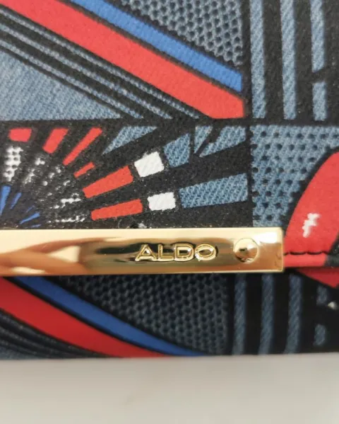 Bolsa de mano Aldo. Bolsa nueva. de mano con diseño de comics. En colores azul, negro y rojo. Con cadena dorada. desmontable para llevarla al hombro. 21 cm de largo, 12 cm de alto y 4 cm de ancho cerrada. Bolsillo interior de jareta con siper en uno de los costados y compartimentos para tarjetas.