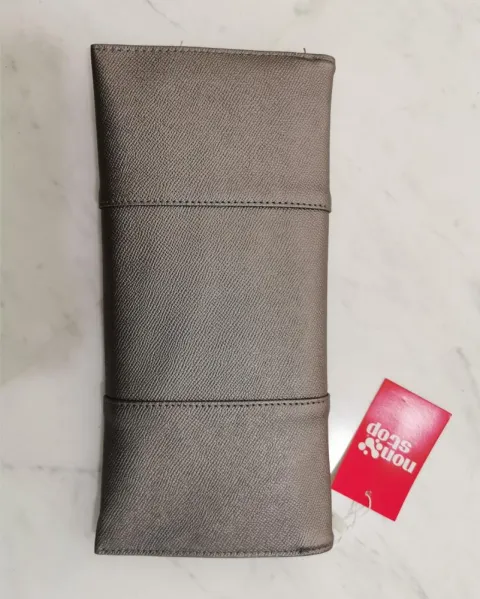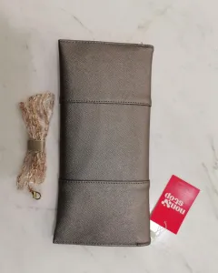 Bolsa de mano Nueva. Acabado imitación piel, color gris, lila. Con cadena dorada desmontable para llevarla al hombro. 30.5 cm de largo, 14.5 cm de alto y 1.5 cm de ancho cerrada. Bolsillos interiores, uno de jareta con siper en un costado y otro de parche en el otro.