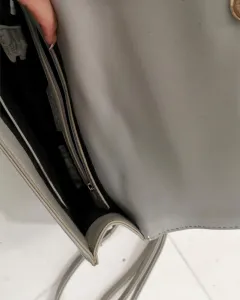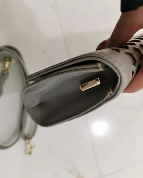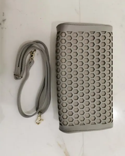 Bolsa de mano. Acabado sintético tipo piel, color gris. Con perforaciones hexagonales. Correa del mismo acabado desmontable para lleva la bolsa al hombro. Bolsillos interiores, uno de jareta con siper de un lado y otro de parche, del otro lado.