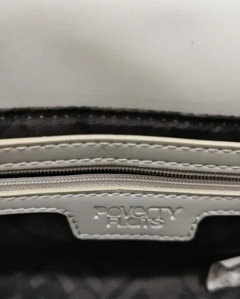 Bolsa de mano Poverty Flats. Bolsa de mano. Acabado sintético tipo piel, color gris. Con perforaciones hexagonales. Correa del mismo acabado desmontable para lleva la bolsa al hombro. Bolsillos interiores, uno de jareta con siper de un lado y otro de parche, del otro lado.