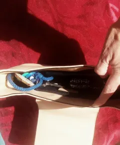 Bolsa pequeña en buen estado, color nude. Tipo carteraMide de correa 48 com. De ancho 25 cm, de profundidad 4 cm. Y en algunos lugares empieza a doblarse. Eso pasa porque las otras bolsas la presionan.