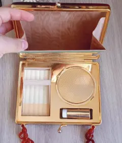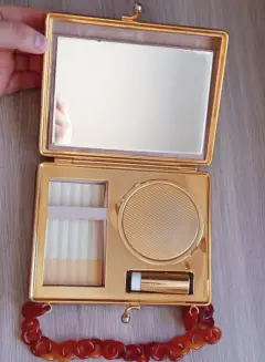 Cosmetiquera Vintage de los años 50's aprox en excelente estado. A contra luz se puede ver un poco rayada sin embargo no afecta su estética o uso Materiales: Metal, simil carey y baquelita