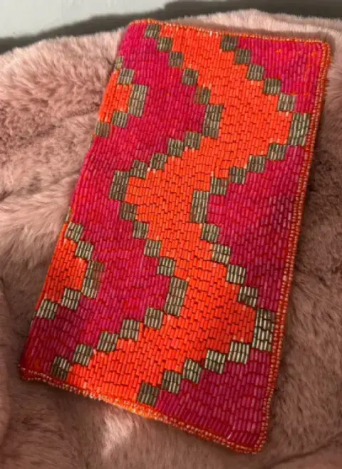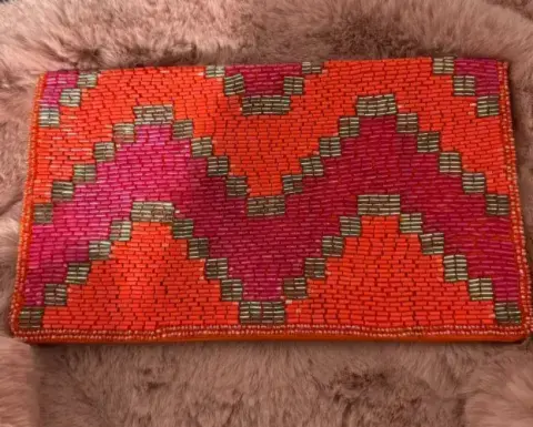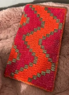 Bonito clutch de canutillo color naranja y rosa, interior naranja. Detalles: no tiene una parte del broche (ese se puede remplazar) y uno que otro canutillo cambio de color, casi imperceptible