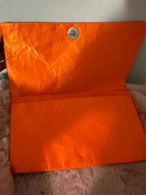Clutch color naranja con rosa. Bonito clutch de canutillo color naranja y rosa, interior naranja. Detalles: no tiene una parte del broche (ese se puede remplazar) y uno que otro canutillo cambio de color, casi imperceptible