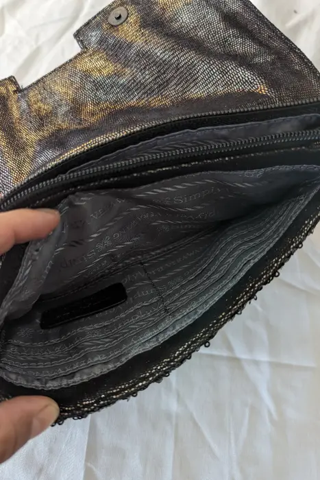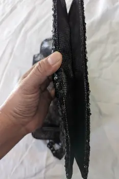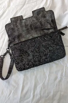 Clutch de mano con lentejuelas. Confeccionada con un deslumbrante tejido de lentejuelas negras, esta pieza añade un toque de brillo sofisticado a cualquier look. Le falta los botones de enfrente , se ven solo los tornillos.