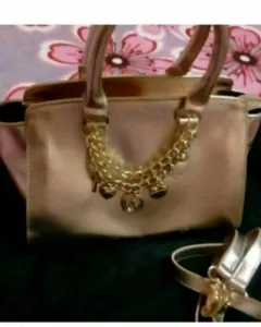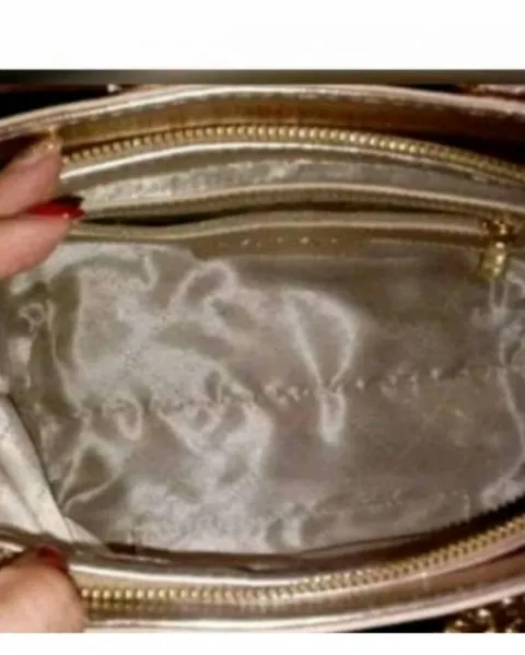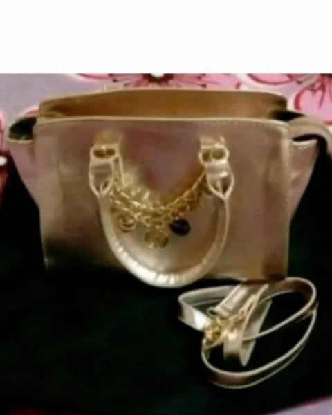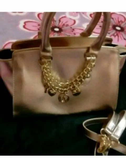 Única pieza de bolsa con correa y asas en tono oro rosado, con collar dorado de la marca. Con las ideales medidas son de 23 cm de largo por 15 cm de alto, tiene bolsita discreta por dentro, con correa desmontable para usarla como más prefieras.De buena marca y calidad, en buen estado. Ideal para guardar tu cartera, cosméticos y pasarla increíble en tu tarde o noche de fiesta y felicidad