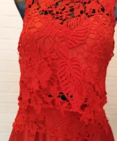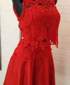 1908-61 Conjunto rojo. Conjunto color rojo 2 piezas Falda tela satin tipo de corte cincle con detalle de encaje en la cintura, cierre en la parte de atrás, blusa tipo cuadrada con forro color roja y tela tipo encaje, cierre en la blusa del lado izquierdo sujeta en la parte de atrás del cuello con botón con un diamante de adorno.