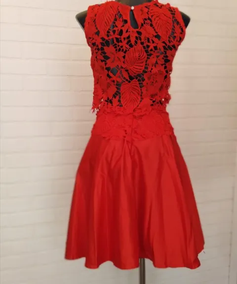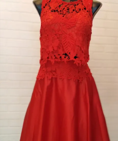 Conjunto color rojo 2 piezas Falda tela satin tipo de corte cincle con detalle de encaje en la cintura, cierre en la parte de atrás, blusa tipo cuadrada con forro color roja y tela tipo encaje, cierre en la blusa del lado izquierdo sujeta en la parte de atrás del cuello con botón con un diamante de adorno.
