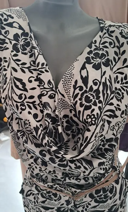 Hermoso conjunto de pantalón y blusa en tela ajustable , talla mediana, es cizado con cuello en v y tiene caída al frente
