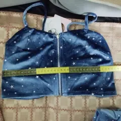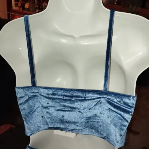 Hermosísimo set de 2 piezas color azul, tela tipo terciopelo, con detalles de estrellas, top y falda cuentan con cierre lateral y resorte en la parte trasera. Marcado como unitalla. Medidas en la última fotoIdeal como un outfit de the eras tour 🥰😍😍😍😍😍No lo puedes dejar perder!!!!!!!!!!