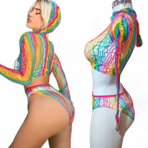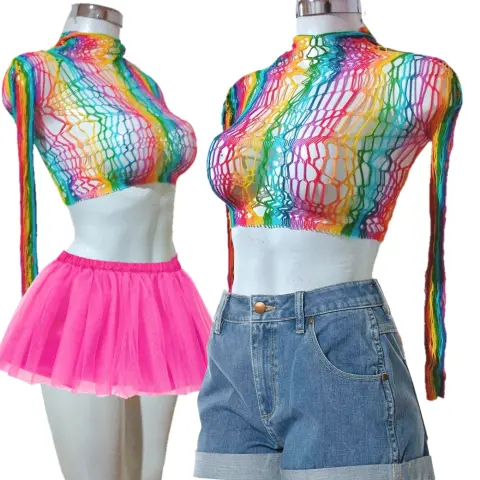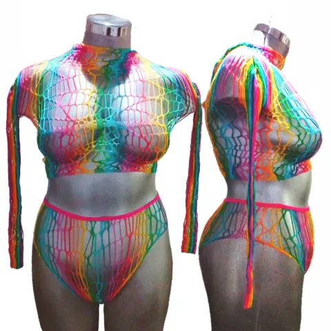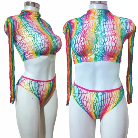 Conjunto Arcoiris Sensual Unitalla. Conjunto Arcoiris Sensual Unitalla Contiene un top y un calzon de red Poliamida y Elastano Color Arcoiris UnitallaOcupalo para una noche divertida, salida de playa , alberca , festivales , fiestas temáticas Combinalo con jeans, shorts , faldas , tutús Destaca tu belleza ! No incluye bra ni panty
