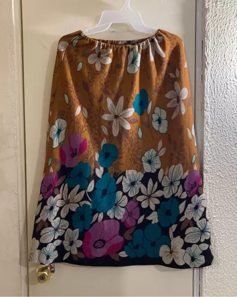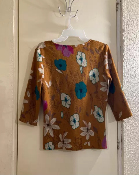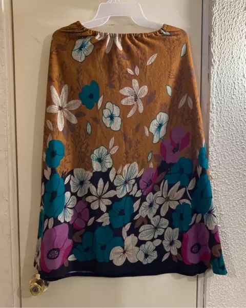 Conjunto blusa y falda mostaza. Conjunto de blusa manga 3/4 y falda corte A con resorte en la cintura, color mostaza con flores, talla 28