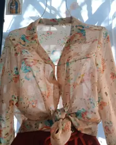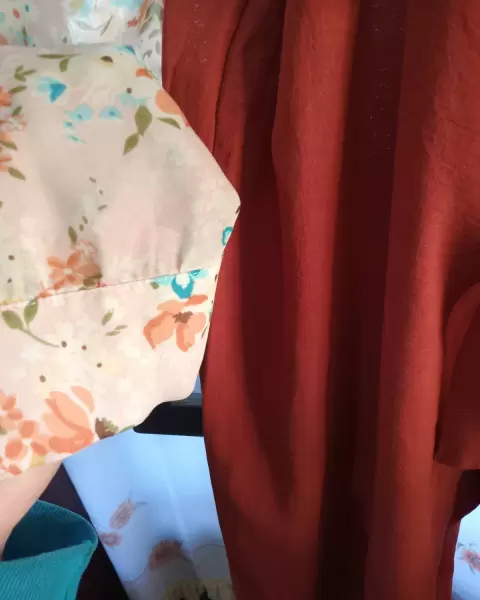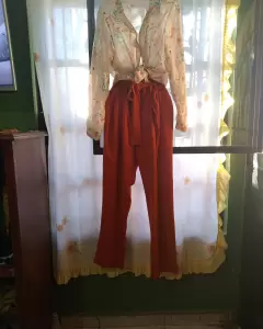 Precioso conjunto que consta de pantalón color chedron, pierna ancha y moño al frente, elástico en la parte trasera y botones al frente; blusa de gasa naranja claro con flores naranja más oscuro 😍😍😍✨