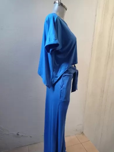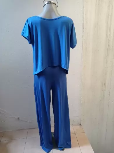 Conjunto de 2 pzas, nuevo, unitalla, el pantalon es a la cintura se ajusta con la cinta y tiene bolsas al costado y es pierna ancha, la blusa corta en picos permite lucir el pantalón, tela Brush , color azul ReyEs nuevo, sin detalles, sin etiqueta, dice puesto una vez x impuestos