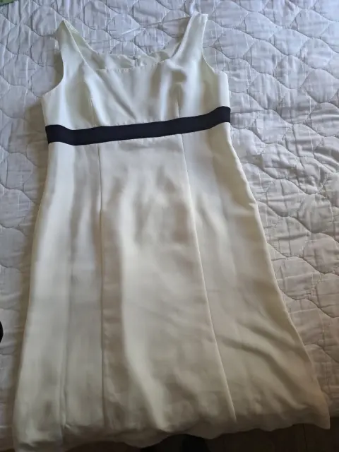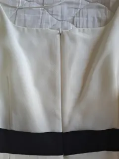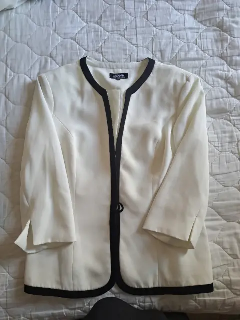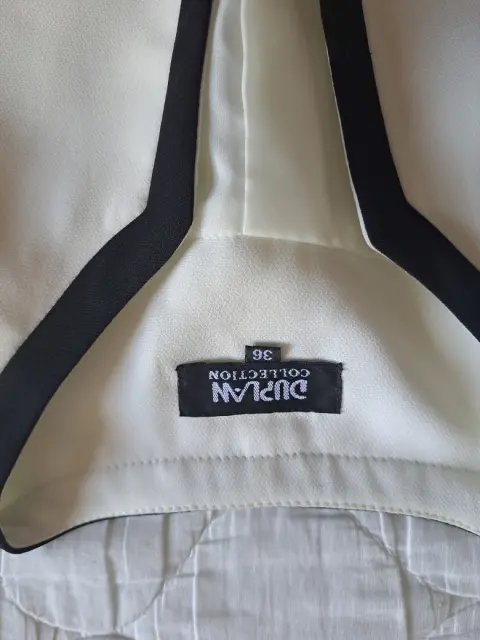 Conjunto para dama de 2 piezas, cuenta con un saco en color hueso y orilla negra, y el vestido color hueso, con una franja negra a la altura del busto, el vestido da un largo a media pantorrilla, tanto el vestido como el saco traen forro, ideal para una reunión, el saco cuenta con un botón, y trae el de repuesto, el vestido esta en buen estado, solo una puesta.