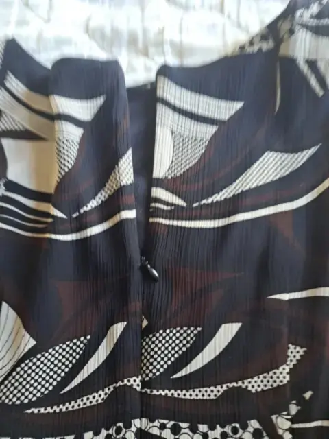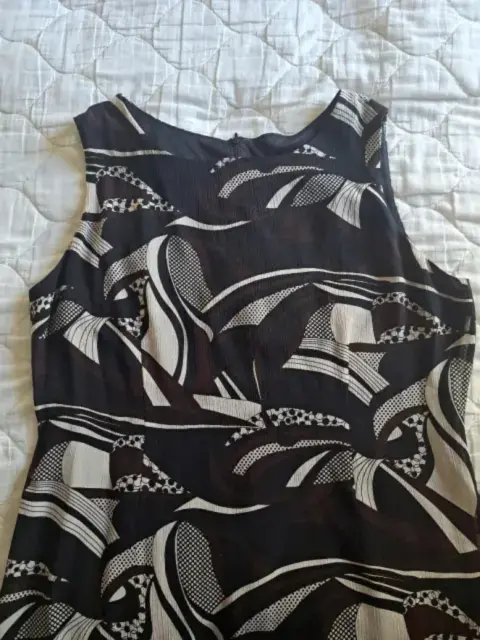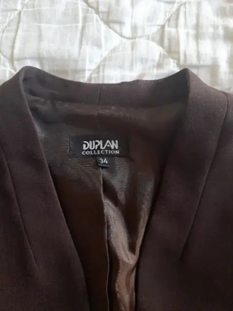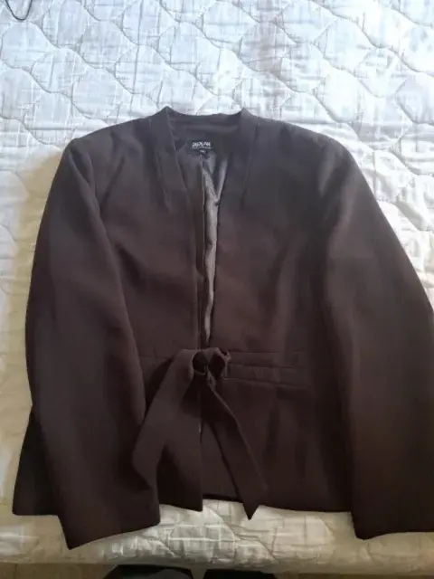 Co junto para dama de 2 piezas en color café, el saco cuenta con forro y es talla 34, este se cierra con cintas que trae a los costados, el vestido es café con estampado en beige y negro, tiene cierre y es sin manga, en la parte inferior cuenta con olanes, ideal para reunión.