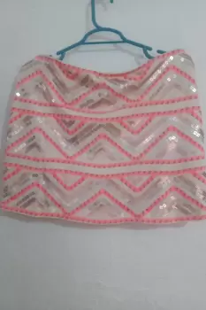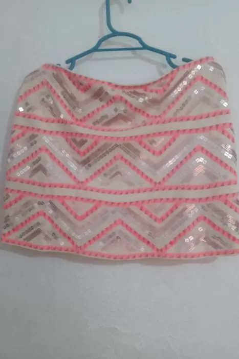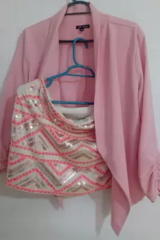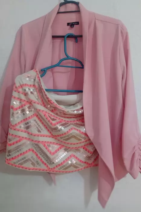Falda con detalles de lentejuelas, colores pastel, la tela tiene licra lo que hace que se ajuste bonito al cuerpo. El saco de tela fresca,con fruncido en mangas corte asimétrico,lo puedes combinar perfecto con unos jeans también