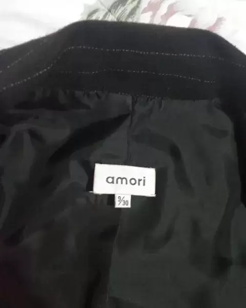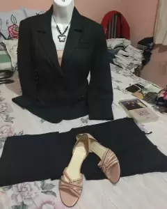 Conjunto de saco y pantalón, 67% poliéster,33% viscosa, forro 100% poliéster. Es color negro con lineas rosas. 40cm de hombro a hombro. 49cm de axilas a axila. 54cm de manga desde la costura. 61cm de largo. Pantalón:41cm de cintura. Tiro medio. 98cm de largo.