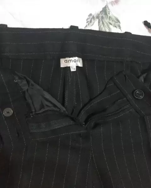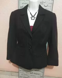 Conjunto de saco y pantalón. Conjunto de saco y pantalón, 67% poliéster,33% viscosa, forro 100% poliéster. Es color negro con lineas rosas. 40cm de hombro a hombro. 49cm de axilas a axila. 54cm de manga desde la costura. 61cm de largo. Pantalón:41cm de cintura. Tiro medio. 98cm de largo.