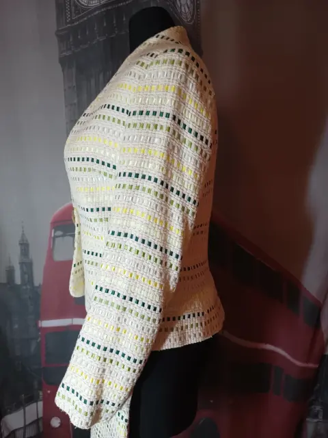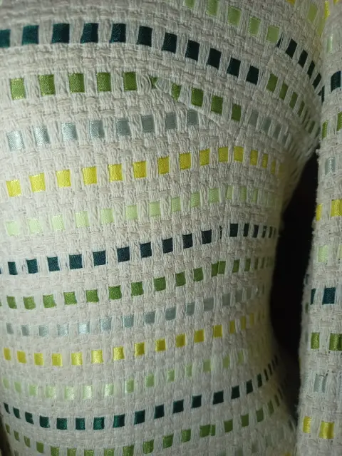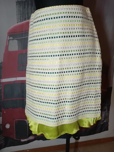 Conjunto elegante. Saco y falda tiene un adorno incluído en la tela. Cómo listones en diferentes tonos de verdes, la falda tiene una olancito que si no es de tu agrado lo puedes quitar.