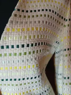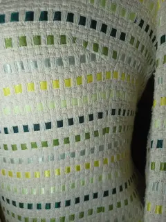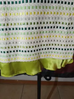 Saco y falda tiene un adorno incluído en la tela. Cómo listones en diferentes tonos de verdes, la falda tiene una olancito que si no es de tu agrado lo puedes quitar.