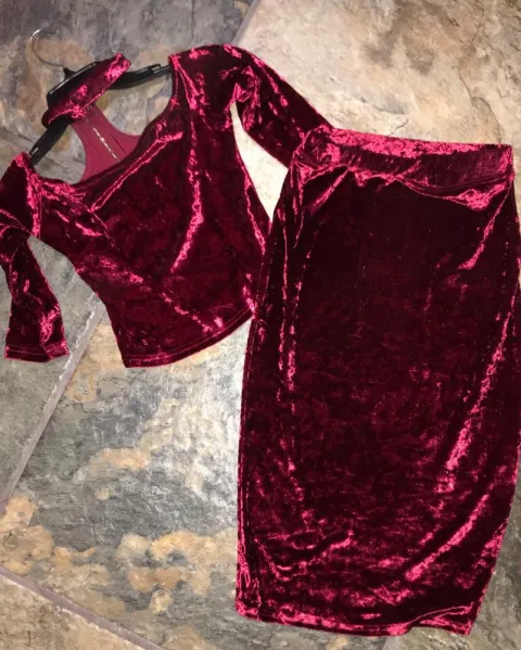Conjunto falda tubo y blusa. Conjunto tono Borgoña o Burgundy 2 pzas. Falda tubo corte largo y blusa manga corta