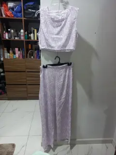 Hermoso conjunto de crop y pantalón color lila pantalón a la cintura con cierre invisible top de corte que favorece la silueta y cierre invisible al costado talla l Considero que queda a m cuenta con stretch mide de axila a axila 49 cm largo desde hombro 38 cm pantalón cintura 39 cm largo total 108 cm totalmente nuevo con etiqueta