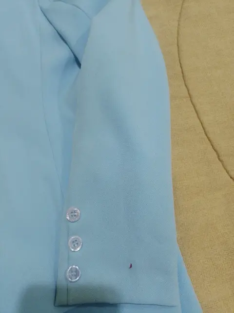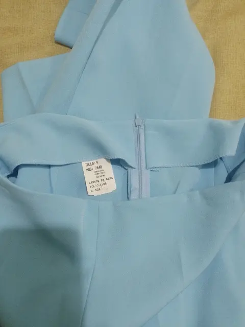 Es un conjunto en color azul claro, tela de buena caída, el pantalón tiene cierre en la parte de atrás, el saco está adornado en las mandas con 3 botones que le dan un buen detalle.