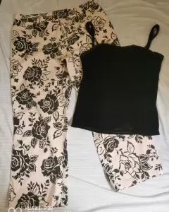 Conjunto pantalón y top. Pantalón corte recto , tiro alto de tela ligera y estampado de flores .Top talla L con sostén integrado .Tela muy suave de terciopelo.Queda a una talla 34o 36