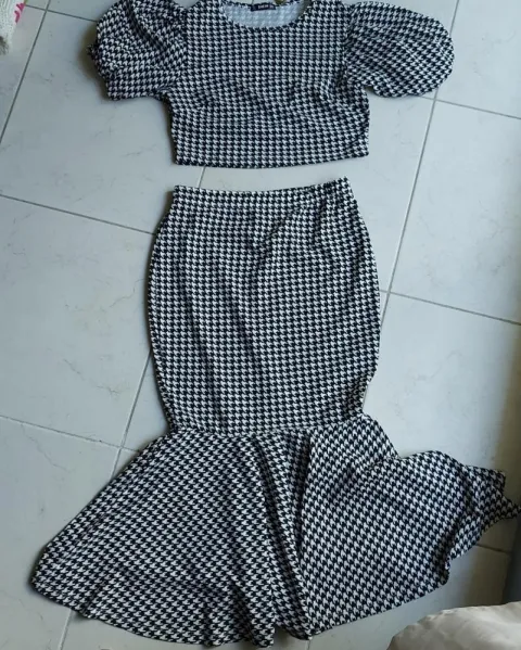 Conjunto pata de gallo. Hermoso conjunto se crop top con falda tipo sirena entallado muy bonito, manga bullona elastico en cintura