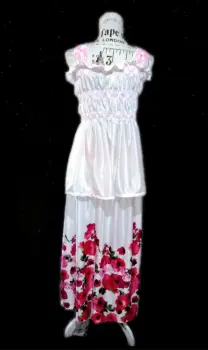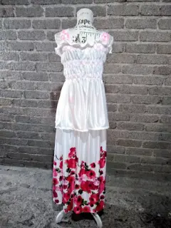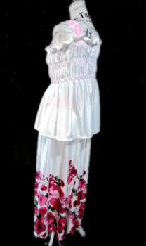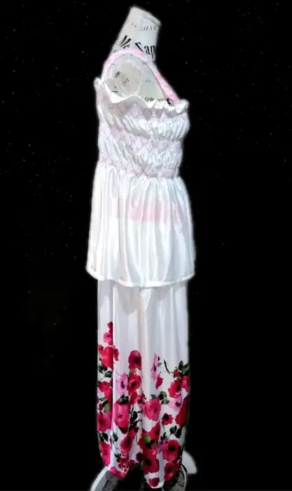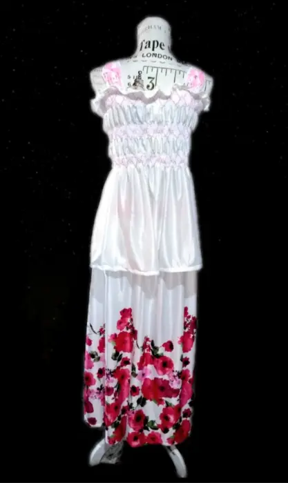 Conjunto de dos piezas parte superior consta de una blusa con tirantes color rosa con blanco, blusa blanca estira la parte del pecho.Parte inferior consta de una falda larga con estampado de flores rojas en la parte de abajo cierre en la parte de atrás talla L es ligero para la calor y muy cómodo es algodón licra totalmente nuevo solo nos queda 1 pieza.
