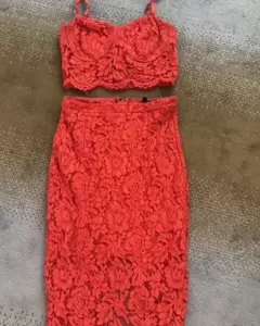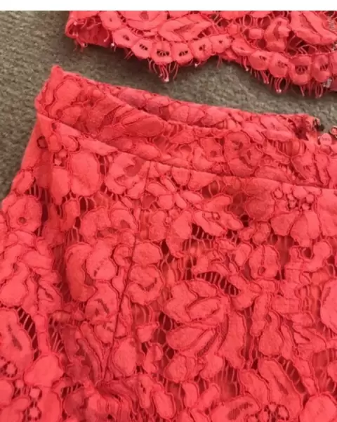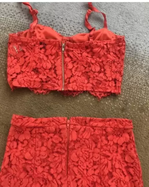 Conjunto rojo. El conjunto tiene tela super delicada que hace se vea hermoso. La falda tiene fondo abajo por lo que no se transparenta. Se ve divino.