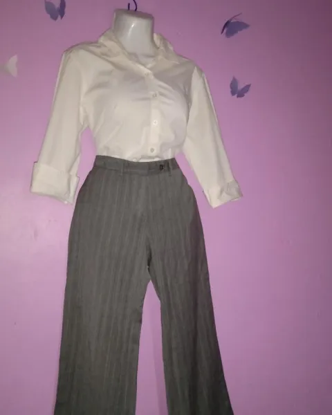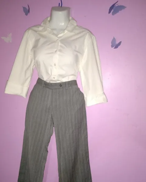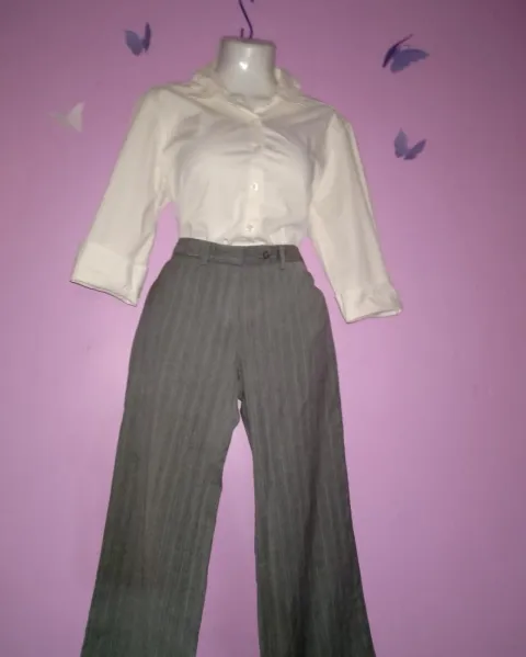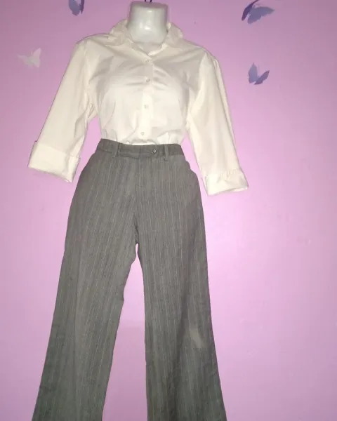 Pantalón de vestir color gris con rayasCon rayasMarca SISLEYLe queda a un 5-7Medidas 35 cmNuevo con etiquetaCamisa color blancaMarca TRIBALTALLA MUN POCO AMPLIAMEDIDAS DE HOMBRO CON HOMBRO 44 CMAXILA CON AXILA 50 CMDE USO SIN DETALLE