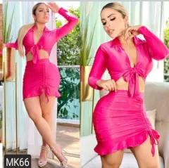 Conjunto rosa de satín. Hermos conjunto de falda con blusa La falda trae jareta ajustable para que elijas el tamaño que quieras usarSolo.se.usó para sesión de fotosEs satin strech Sin detalles