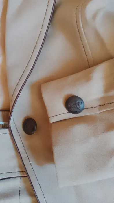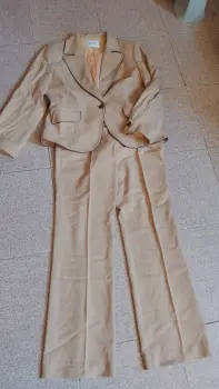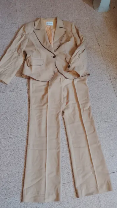 Conjunto de saco y pantalón marca Julio. color camello. Y detalles den café. Saco de un botón al frente. Bolsillos simulados, no funcionales