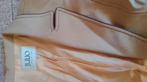 Conjunto saco y pantalón talla 10. Conjunto de saco y pantalón marca Julio. color camello. Y detalles den café. Saco de un botón al frente. Bolsillos simulados, no funcionales