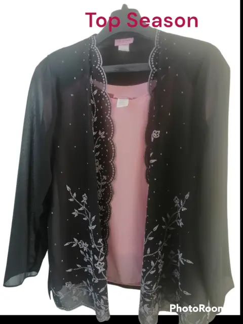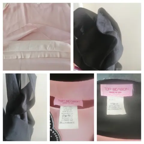 Conjunto Top Season 3 piezas con forro. Hermoso conjunto de tres piezas negro con rosa Top Season 2X tela fresca con detalles de pedrería lo hace ver elegante, las medidas tomaron con cinta metrica por un lado, envio caja reciclada,los viernes Medidas SACO axila a axila 60 cm Largo manga 58 cm hombros 42 cm largo 70 cm BLUSA axila a axila 56 cm ancho 62 largo 62 cm PANTALÓN resorte sin estirar 36cm máx 60 largo 97cm único detalle lo anexo en la foto de la blusa