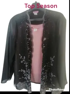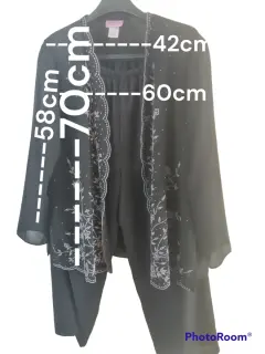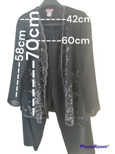 Hermoso conjunto de tres piezas negro con rosa Top Season 2X tela fresca con detalles de pedrería lo hace ver elegante, las medidas tomaron con cinta metrica por un lado, envio caja reciclada,los viernes Medidas SACO axila a axila 60 cm Largo manga 58 cm hombros 42 cm largo 70 cm BLUSA axila a axila 56 cm ancho 62 largo 62 cm PANTALÓN resorte sin estirar 36cm máx 60 largo 97cm único detalle lo anexo en la foto de la blusa
