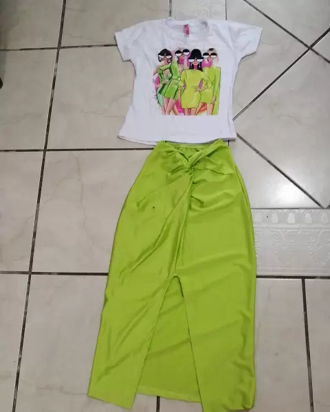 Divino conjunto verde neón. Padrisimo conjunto de playera con estampado coqueto y falda verde neón, super cool, talla S completamente nuevo