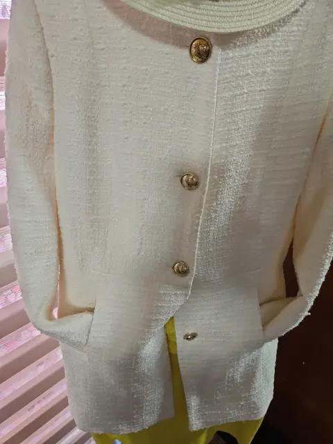 Amarillo sincretico y blanco elegante colores de saco larho cadera con hermosa abotonadura dorada y falda corte clásico apertura discreta atrás. Te viste de suerte!