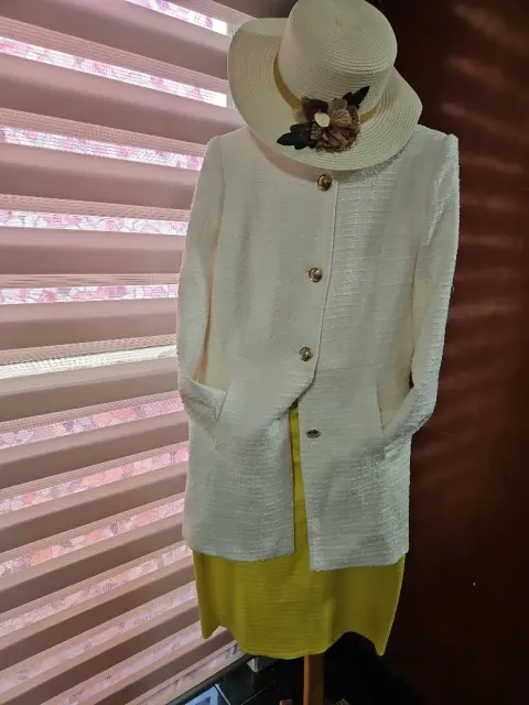 Elegante sincretismo. Amarillo sincretico y blanco elegante colores de saco larho cadera con hermosa abotonadura dorada y falda corte clásico apertura discreta atrás. Te viste de suerte!