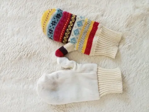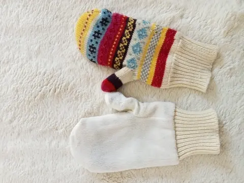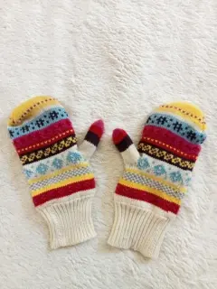 Guantes Weekend. Guantes tipo manopla, afelpados, unitalla. Marca weekend. Diseño de copos de nieve.