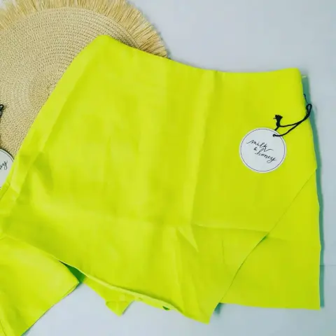 De la marca Milk & Honey, hermoso set de 2 piezas en color lima, te encantará! Es blusa y Falda short. El material y acabados son perfectos, si ya conoces la marca seguro lo sabes. La tela es de vestir.