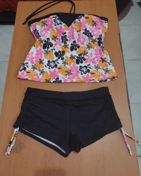 Hermoso traje de baño. Hermoso traje de baño con blusa floreada en varios colores la blusa por dentro trae sus almohadillas para que no se marquen tus pezones,el shorts negro liso con cintas a los costados que puedes ASER el shorts más cachetero si así lo deseas d ambas piezas de muy buena tela que te permite sentirte cómoda y ligera.
